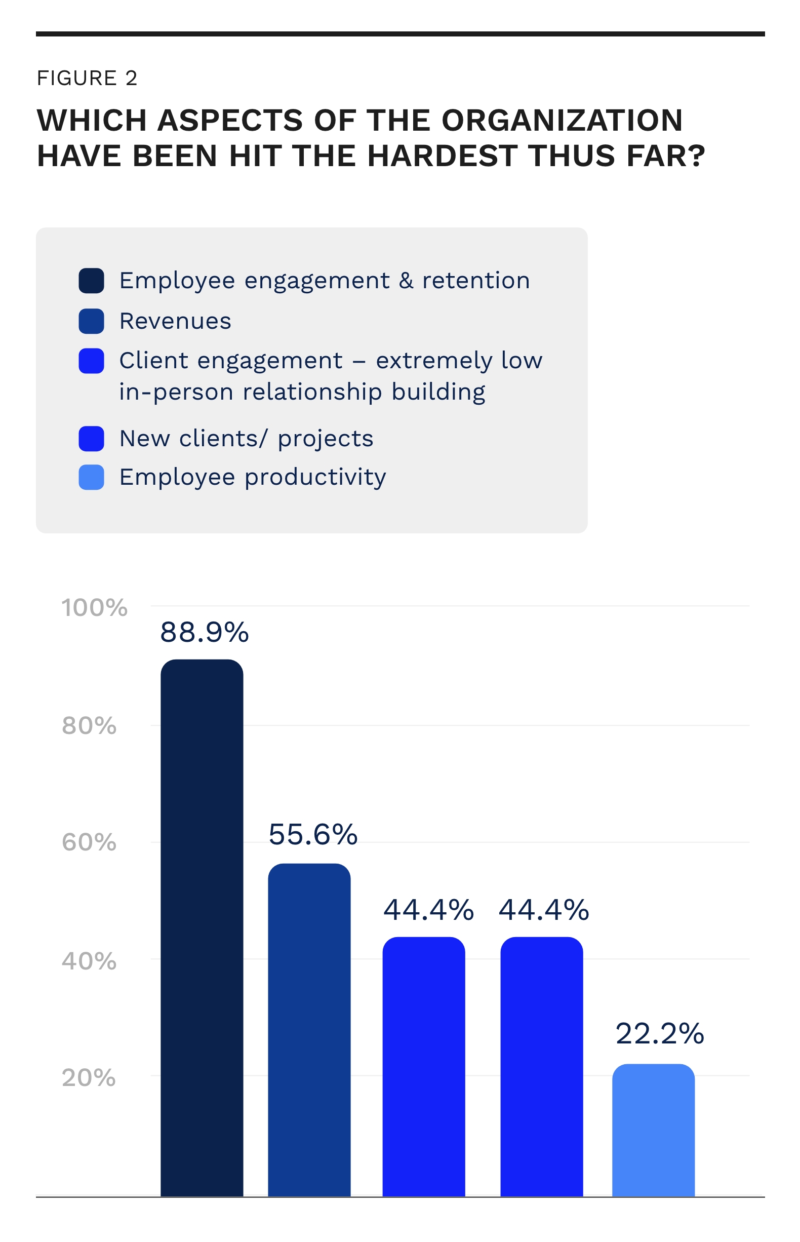 While 88.9% of the leaders surveyed say that COVID has deeply impacted their organizations, the same number also agreed that employee engagement and retention have been affected the most. The sheer organizational unpreparedness with respect to employee engagement is what forced leaders to rethink their talent practices and focus on creating a more flexible working environment.